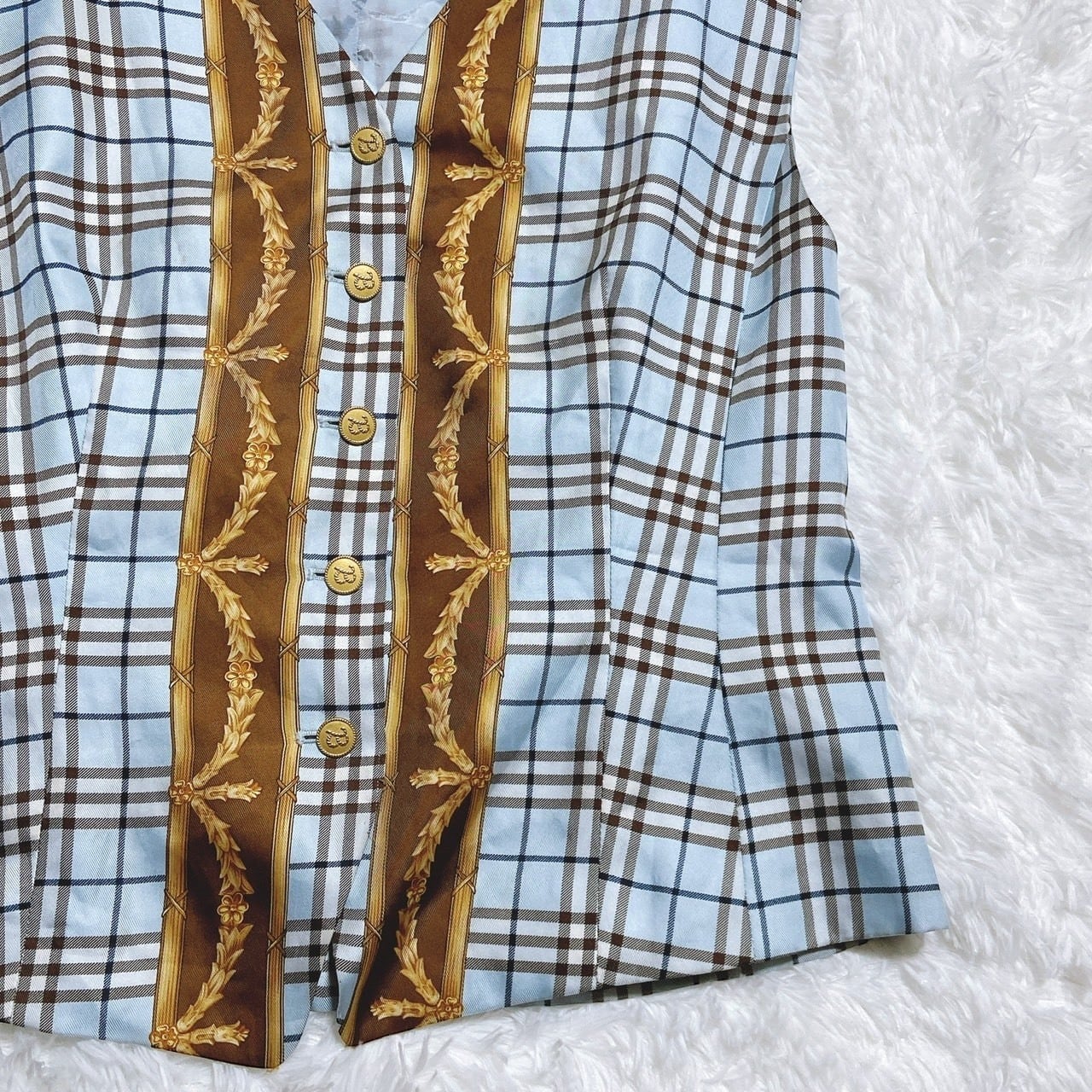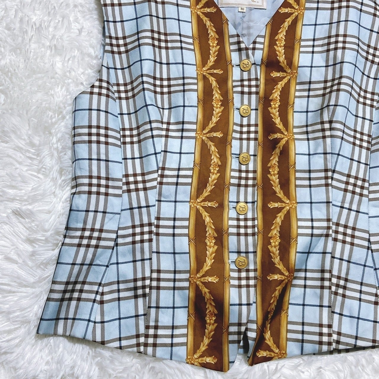 ベスト ジレ スカーフ柄 ノバチェック 金ボタン レディース 白タグ 希少 春 夏 秋 爽快 チェック 古着