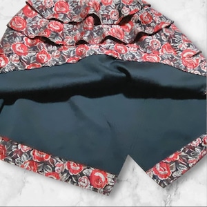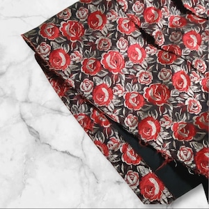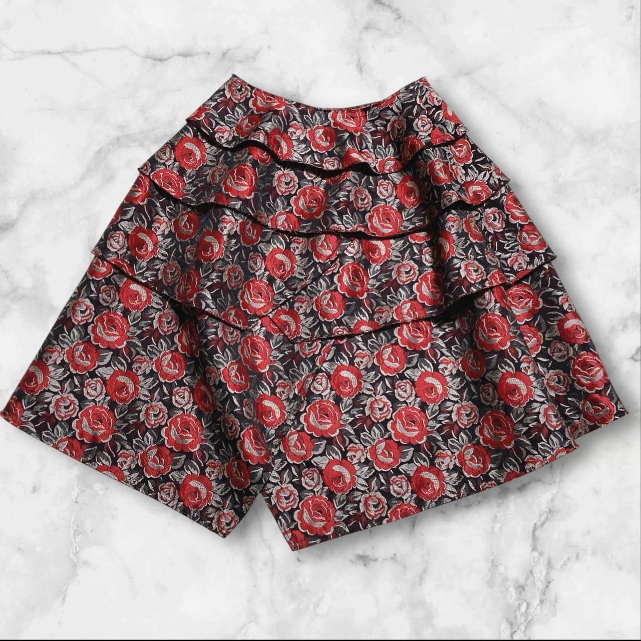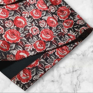 このティアードスカートは、しっかりとしたゴブラン織りで、華やかさとしなやかさを兼ね備えた一品です。パンク期の象徴とも言えるローズ柄が、個性的でありながら、どんなトップスとも相性抜群。デイリーユースにはもちろん、特別なシーンにもぴったりのスカートです。